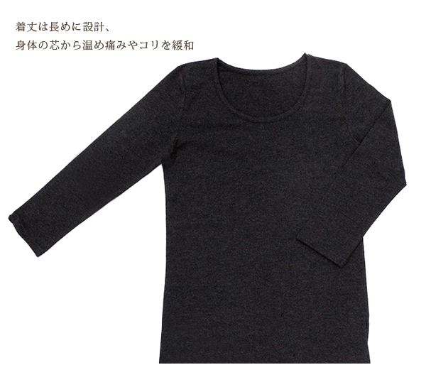 着丈は長めに設計、身体の芯から温め痛みやコリを緩和。動きやすいソフトでしなやかな着心地です。