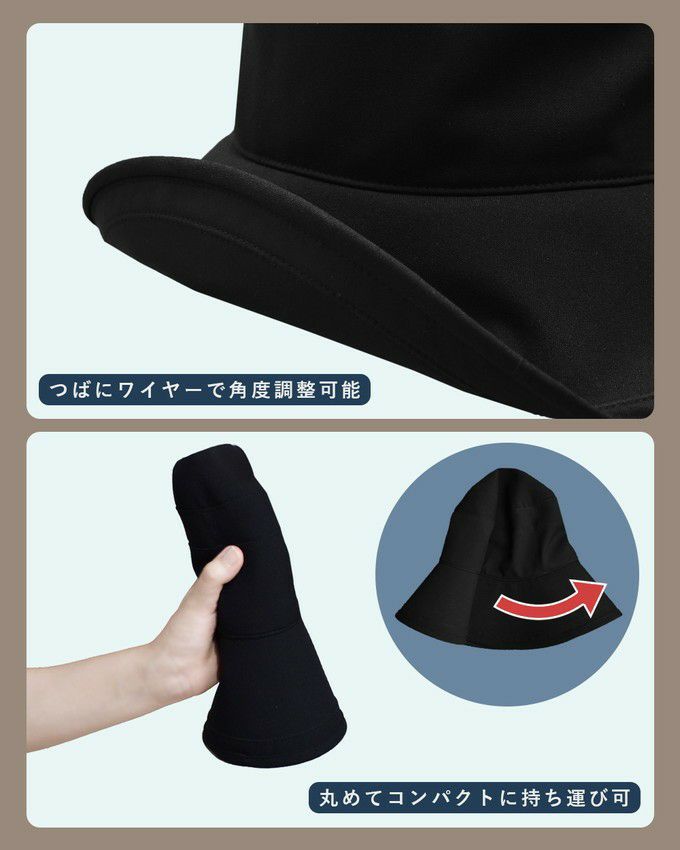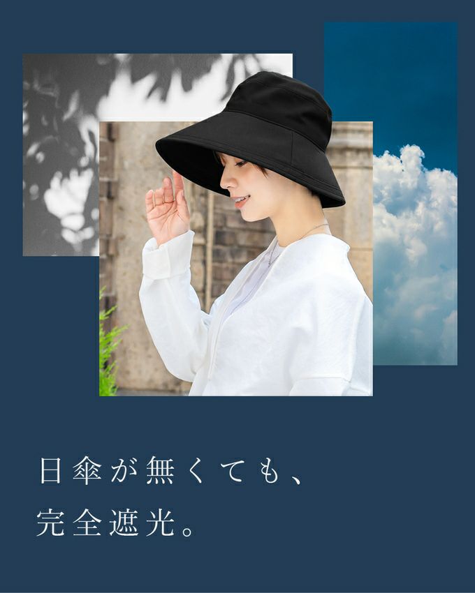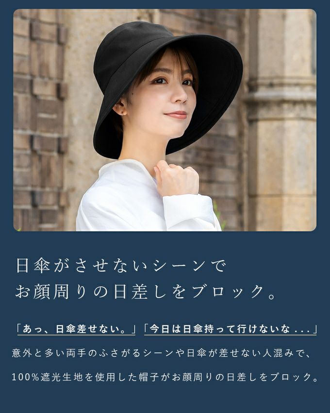 「あっ、今日傘差せない。」「今日は日傘持って行けないな . . .」意外と多い両手の塞がるシーンや日傘が差せない人混みで、100%遮光生地を使用した帽子がお顔周りの日差しをブロックします。