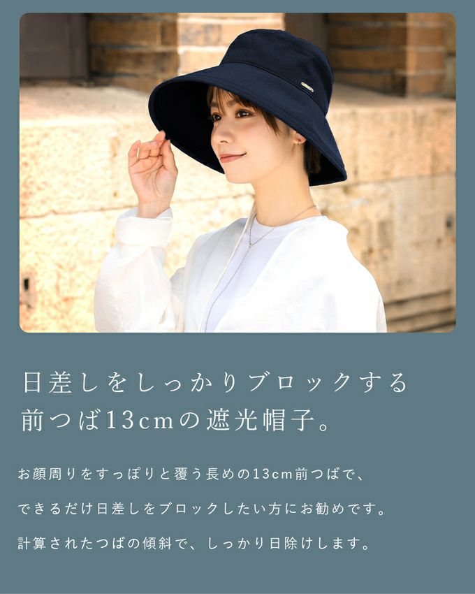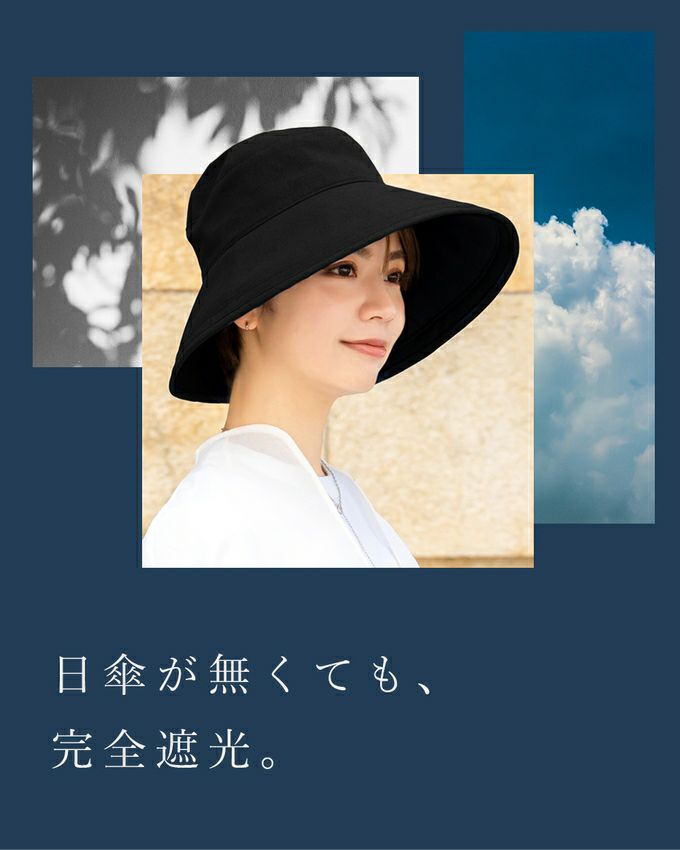 「あっ、今日傘差せない。」「今日は日傘持って行けないな . . .」意外と多い両手の塞がるシーンや日傘が差せない人混みで、100%遮光生地を使用した帽子がお顔周りの日差しをブロックします。