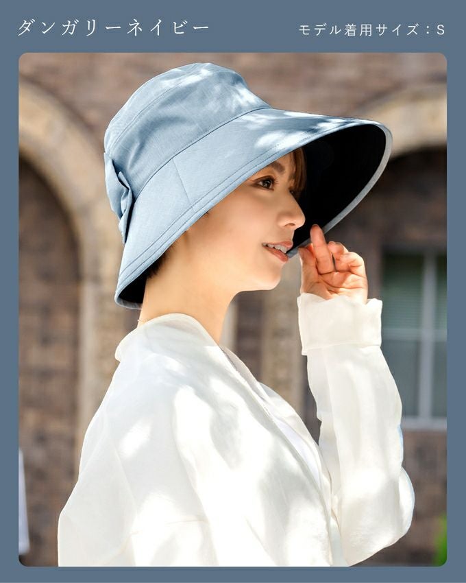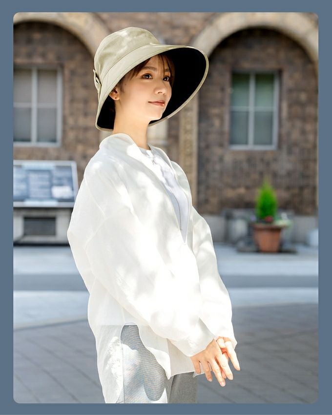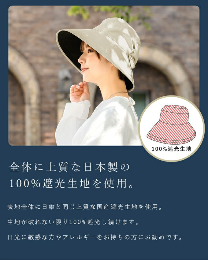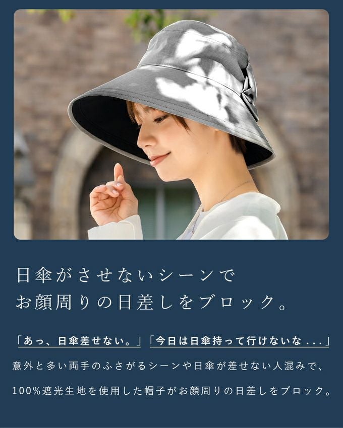 意外と多い両手の塞がるシーンや日傘が差せない人混みで、100%遮光生地を使用した帽子がお顔周りの日差しをブロックします。
