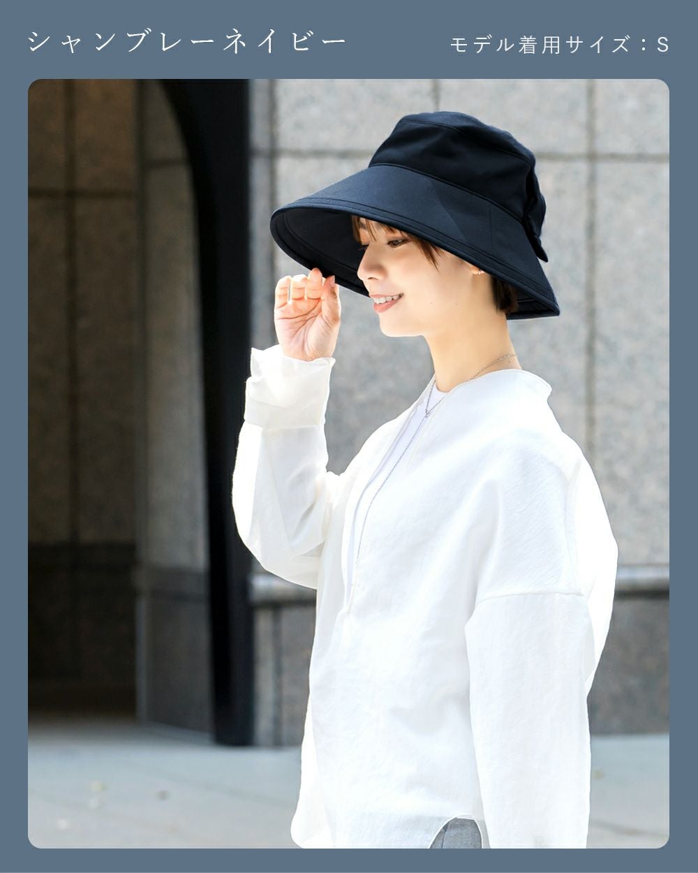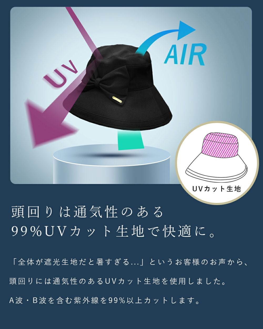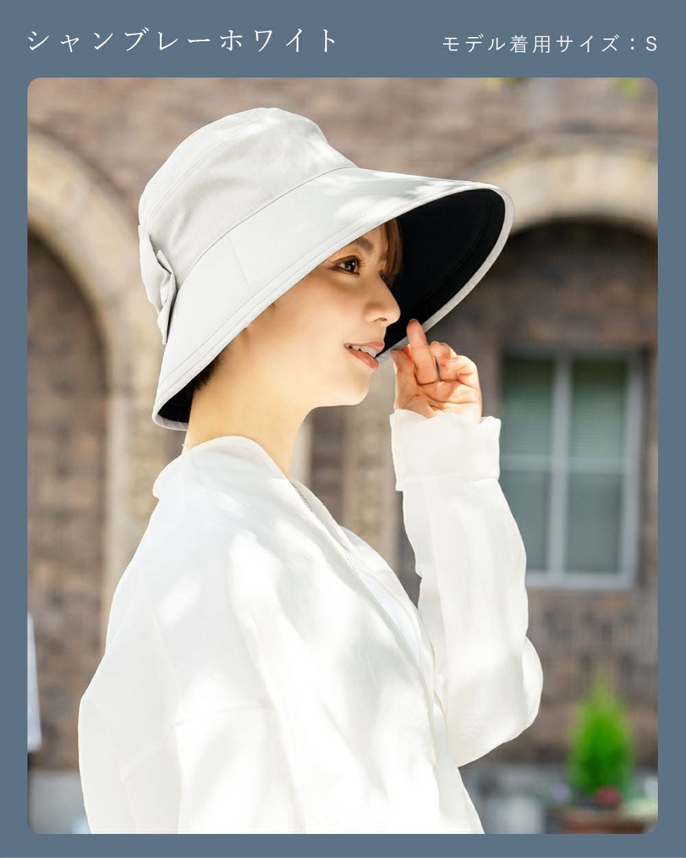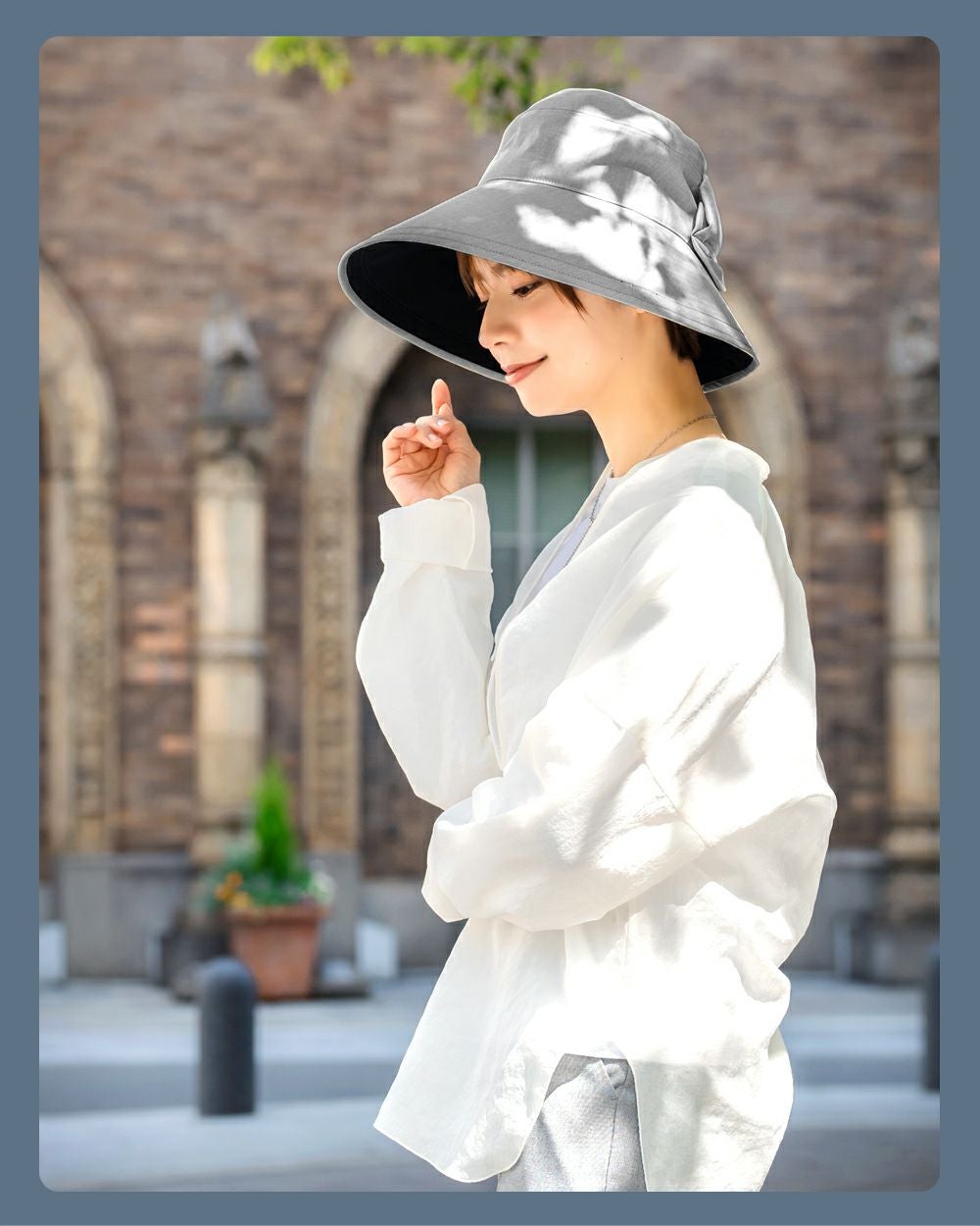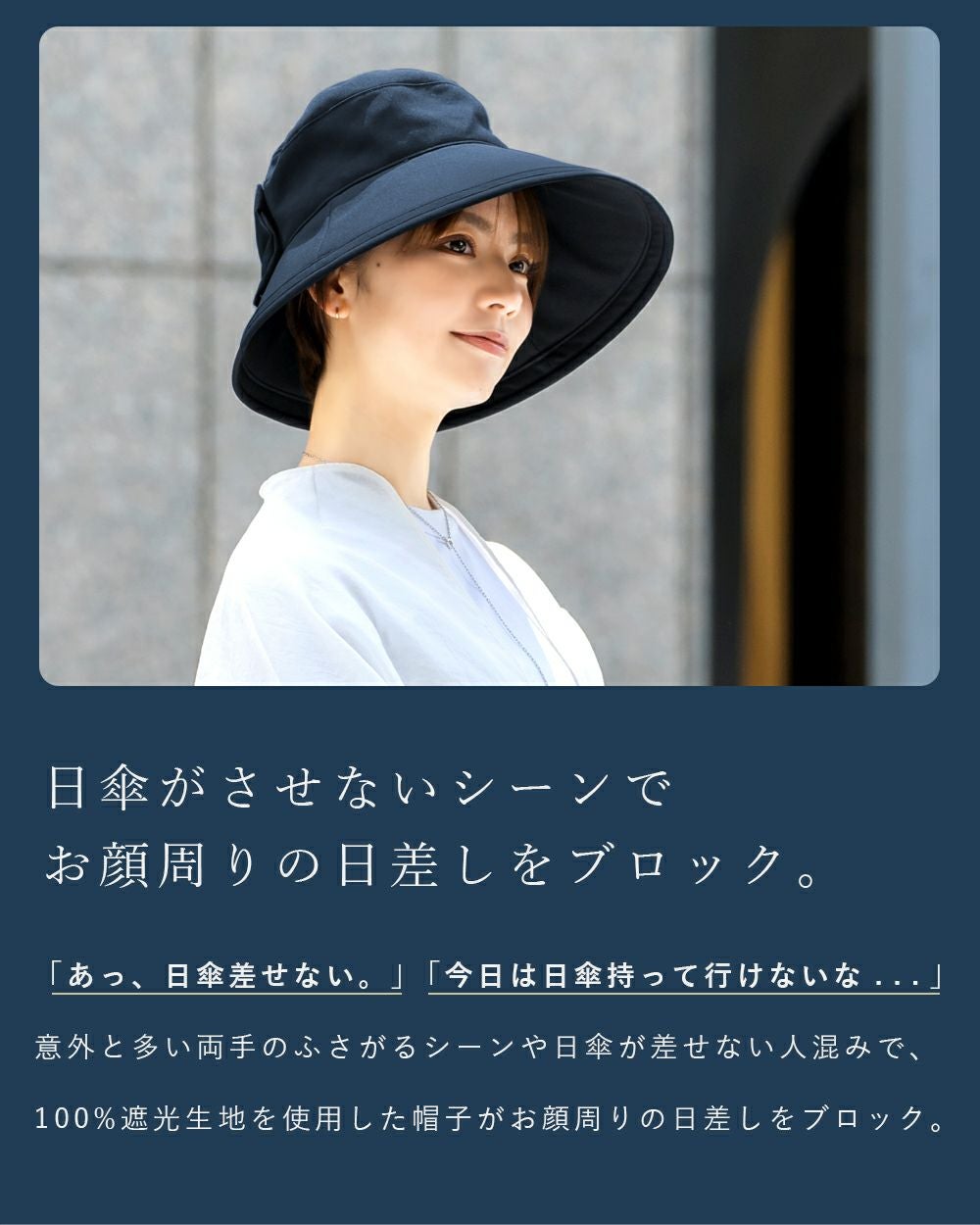 意外と多い両手の塞がるシーンや日傘が差せない人混みで、100%遮光生地を使用した帽子がお顔周りの日差しをブロックします。