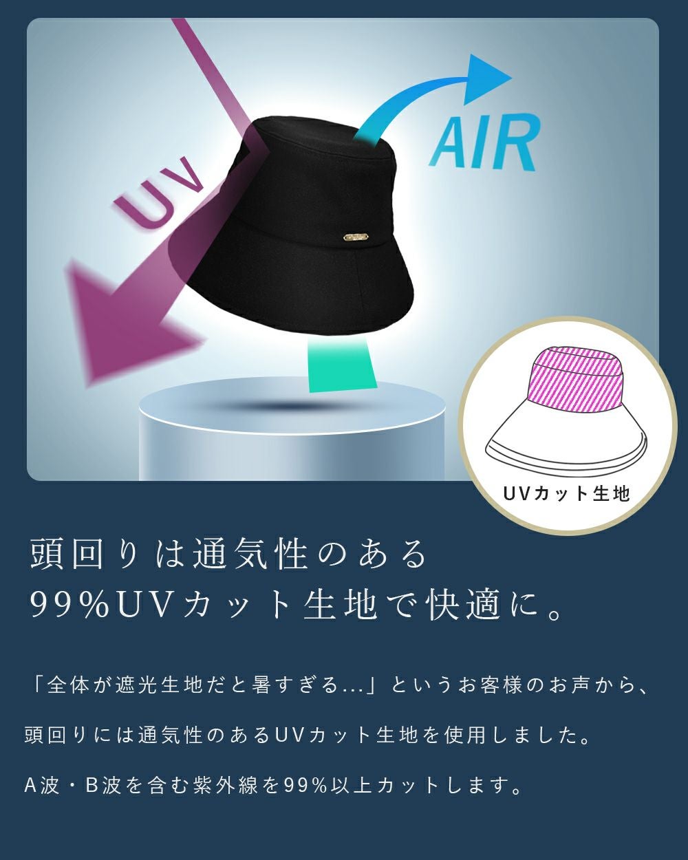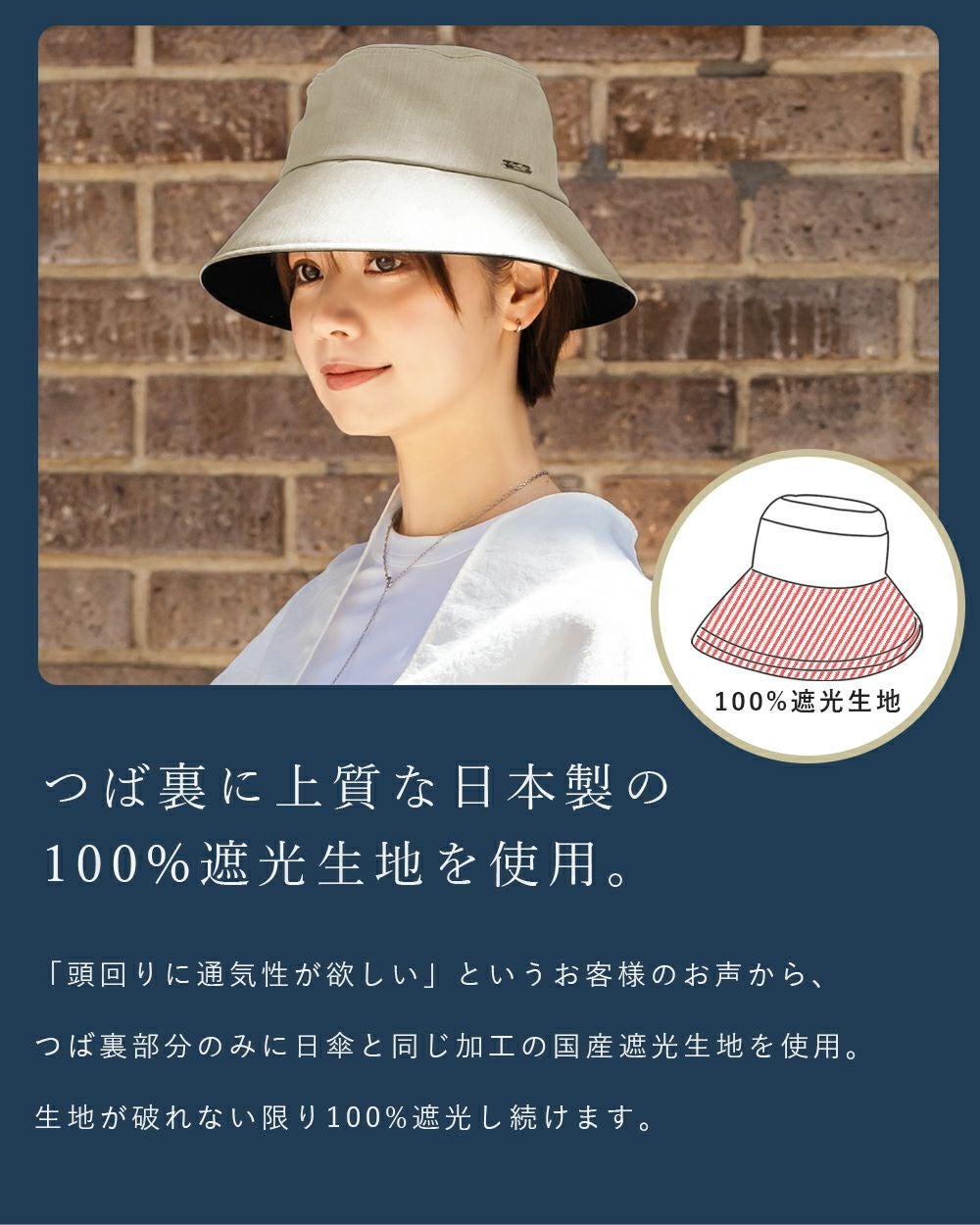 意外と多い両手の塞がるシーンや日傘が差せない人混みで、100%遮光生地を使用した帽子がお顔周りの日差しをブロックします。