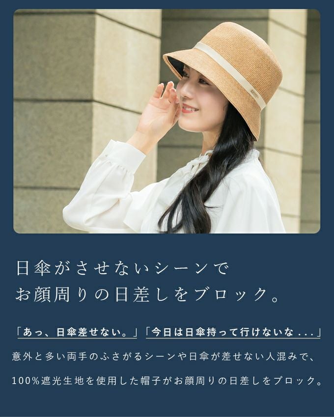 意外と多い両手の塞がるシーンや日傘が差せない人混みで、100%遮光生地を使用した帽子がお顔周りの日差しをブロックします。