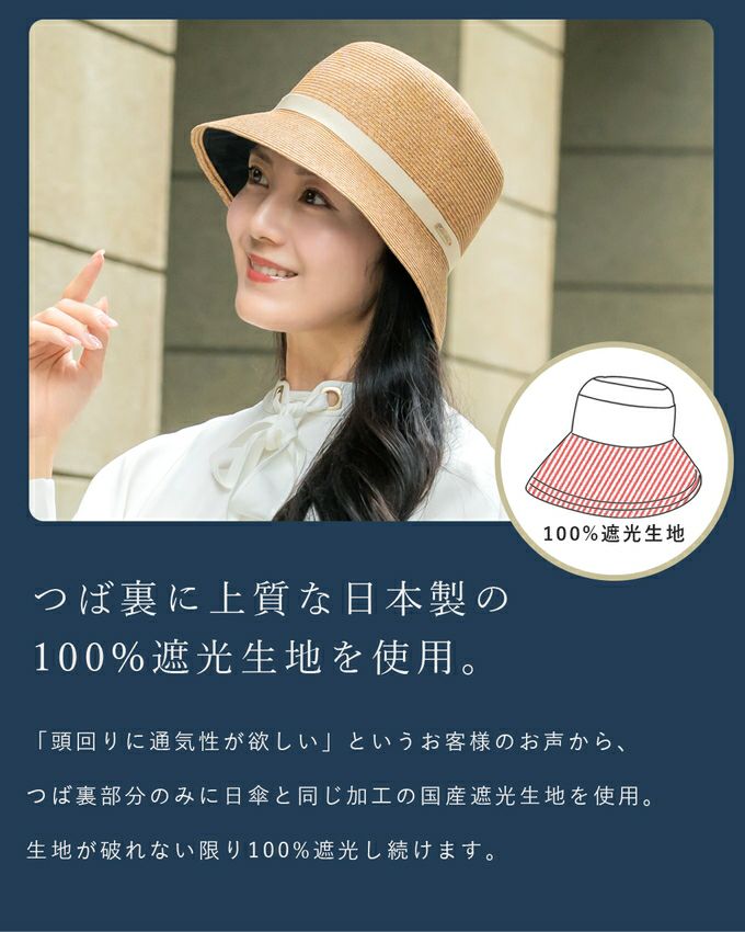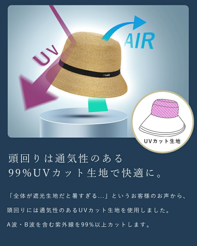 つば裏には100%遮光生地を使用。汚れたり摩擦しても遮光率は落ちず生地が破れない限り遮光性能はキープします。頭頂部や頭周りの生地はUV(A波/B波)遮蔽率99%を達成し紫外線をシャットアウト!