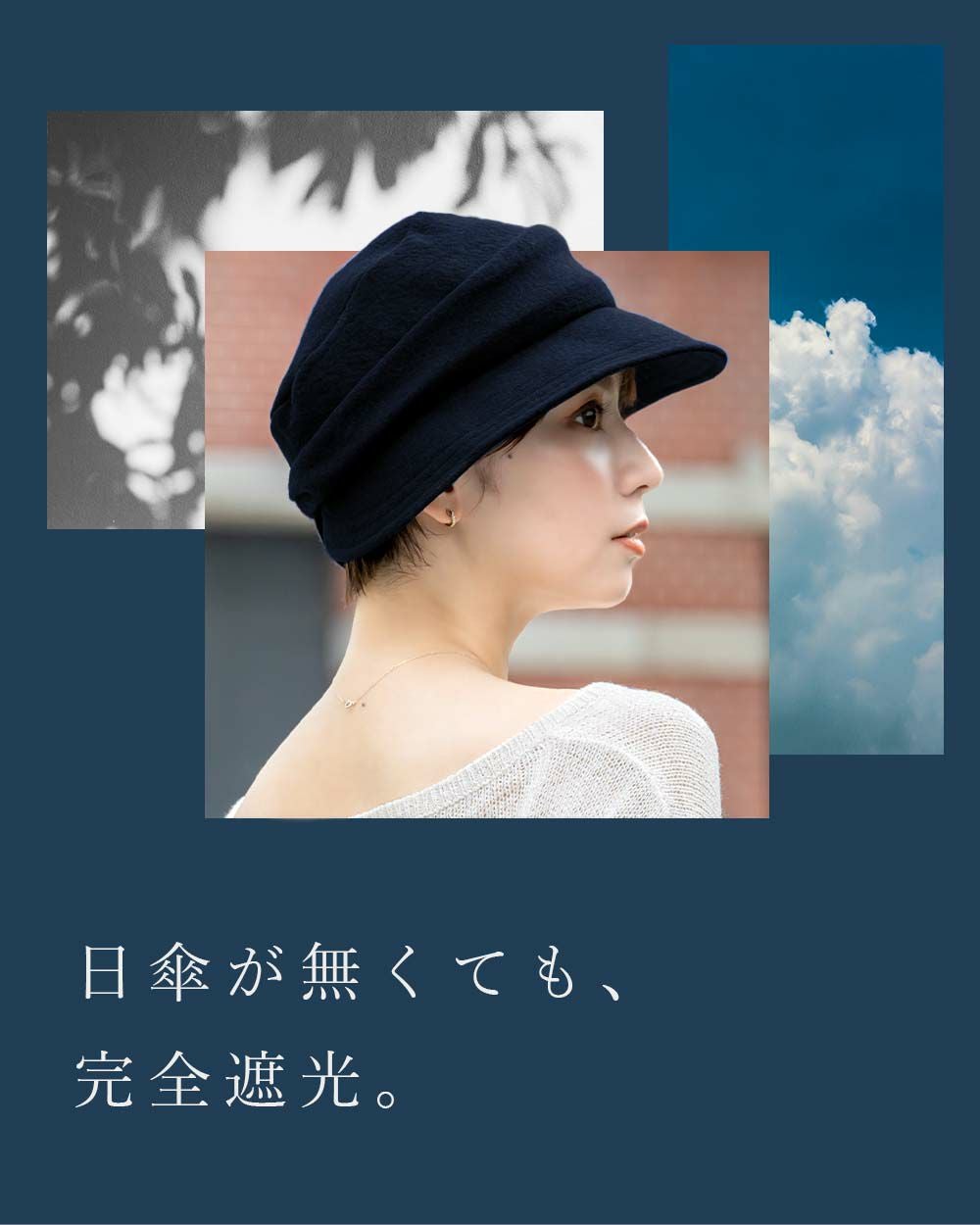 意外と多い両手の塞がるシーンや日傘が差せない人混みで、100%遮光生地を使用した帽子がお顔周りの日差しをブロックします。