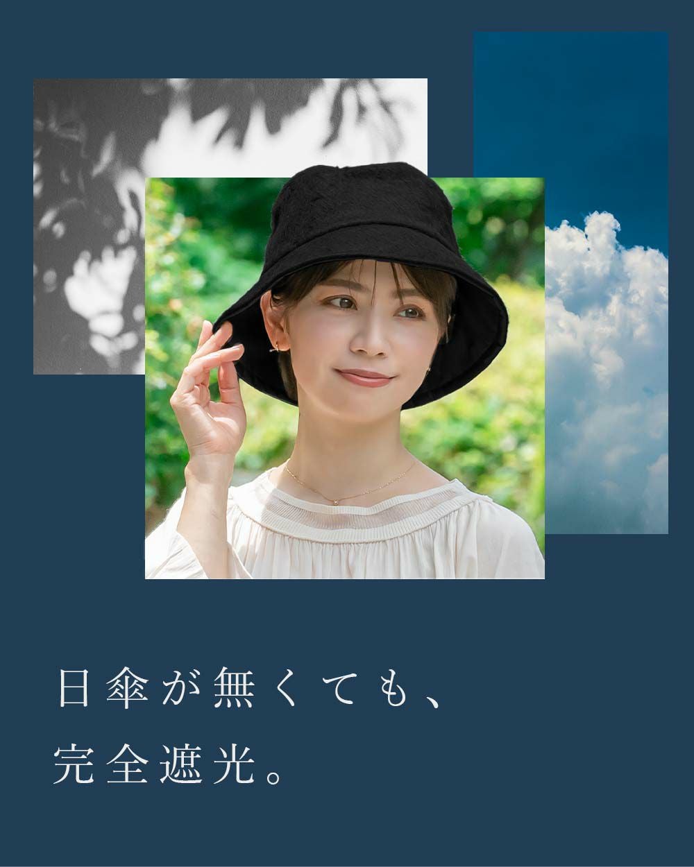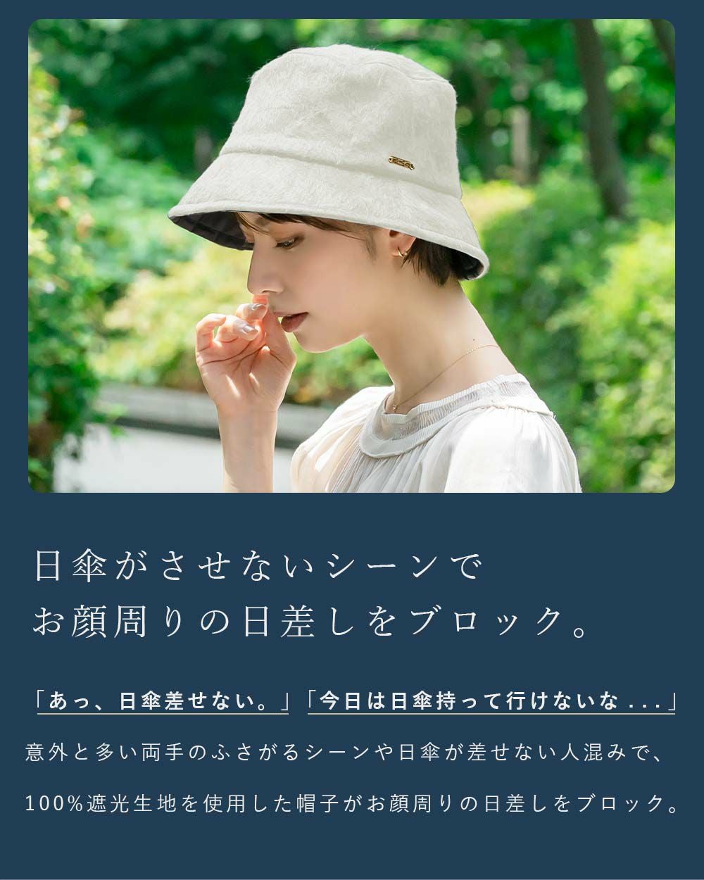 意外と多い両手の塞がるシーンや日傘が差せない人混みで、100%遮光生地を使用した帽子がお顔周りの日差しをブロックします。