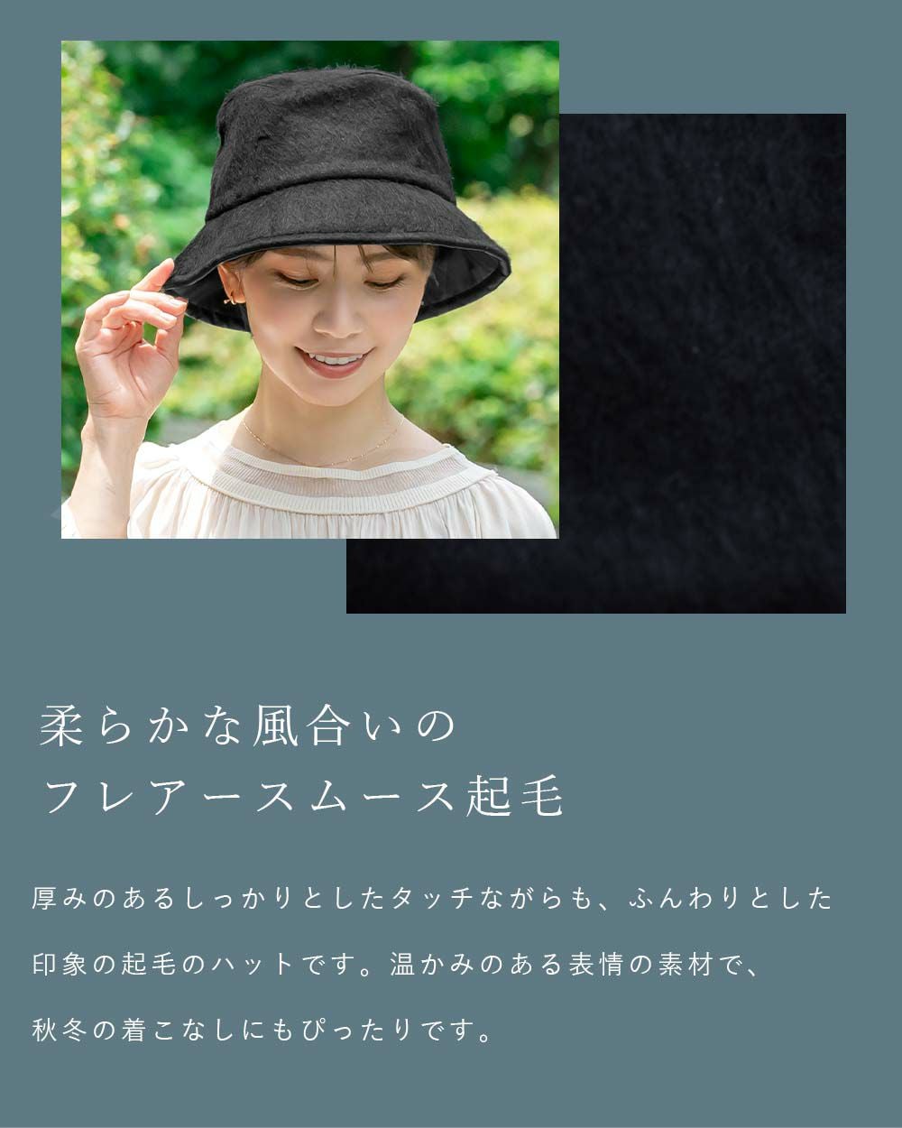 厚みのあるしっかりとしたタッチながらも、ふんわりとした印象のフレアースムース起毛のハットです。 温かみのある表情の素材で、秋冬のきこなしにもぴったりです。