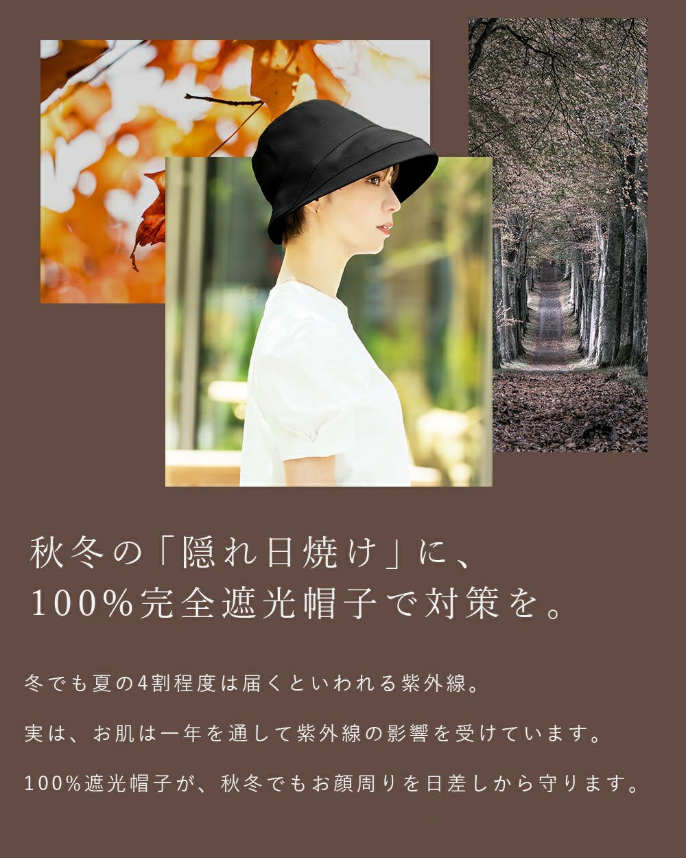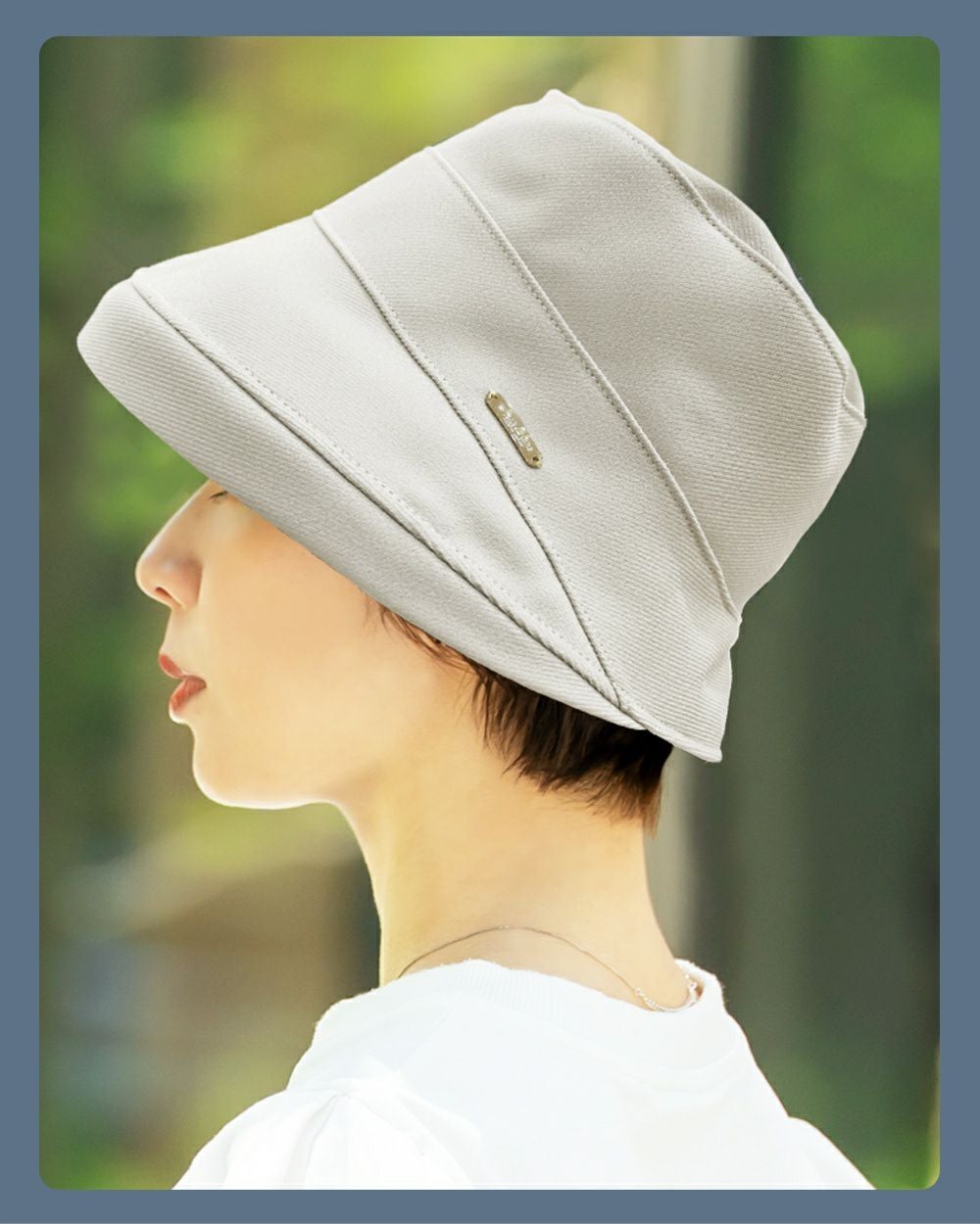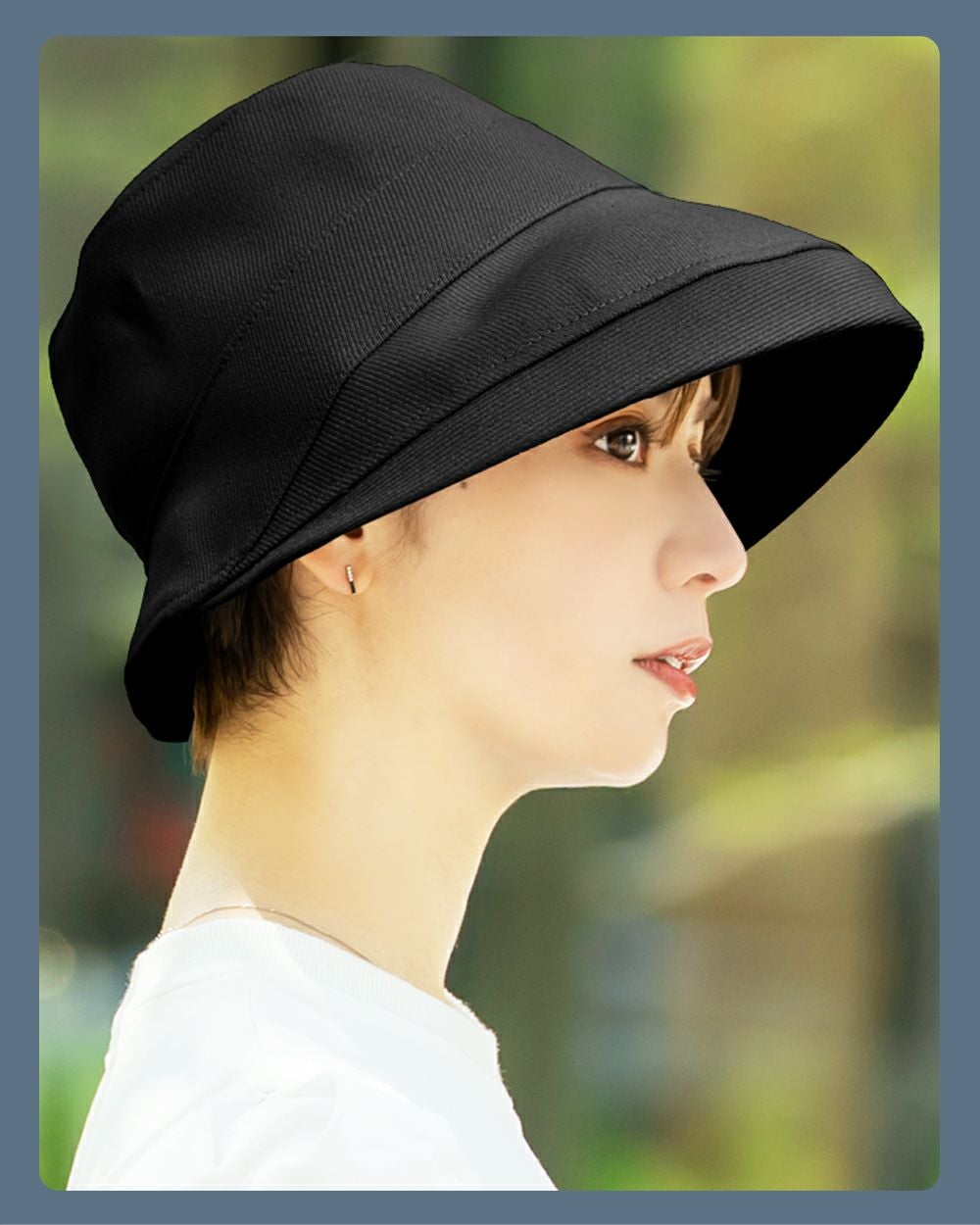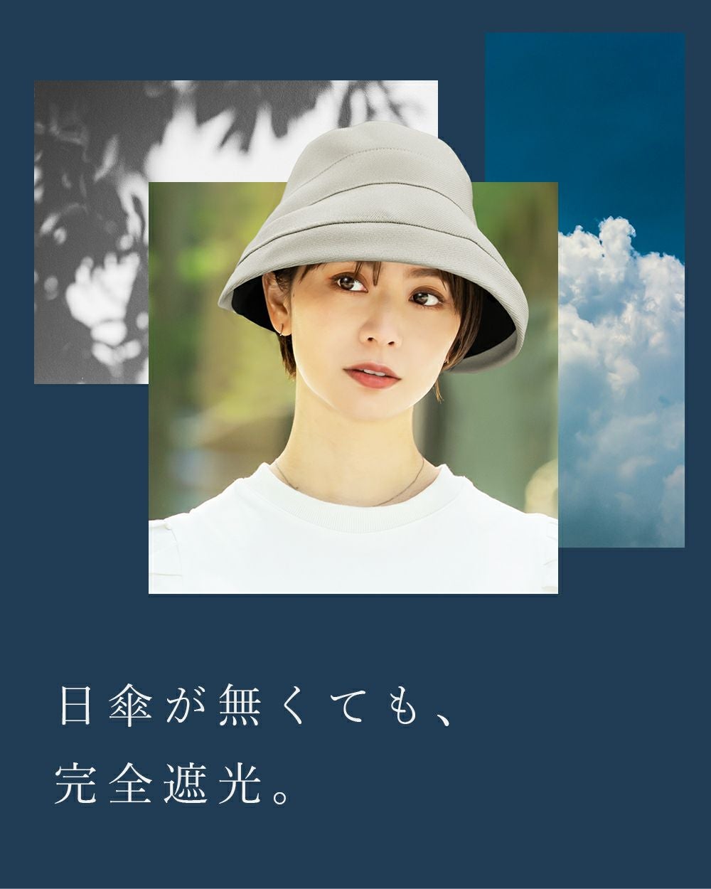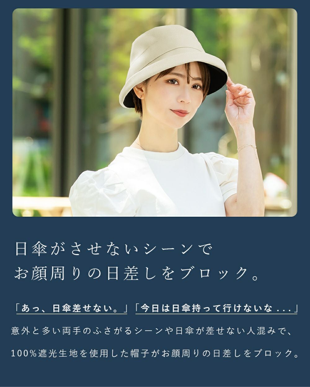 意外と多い両手の塞がるシーンや日傘が差せない人混みで、100%遮光生地を使用した帽子がお顔周りの日差しをブロックします。