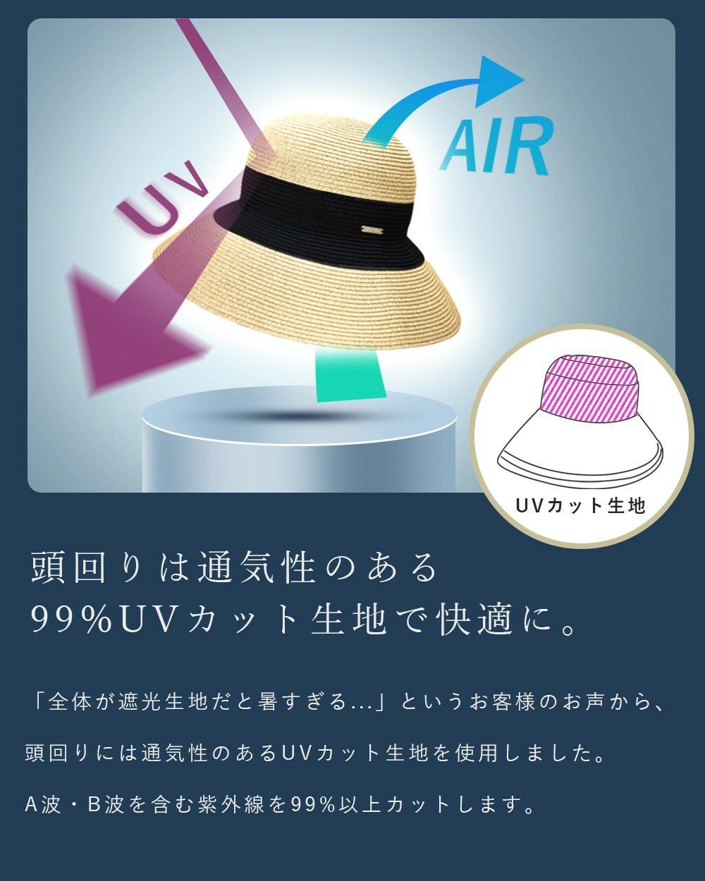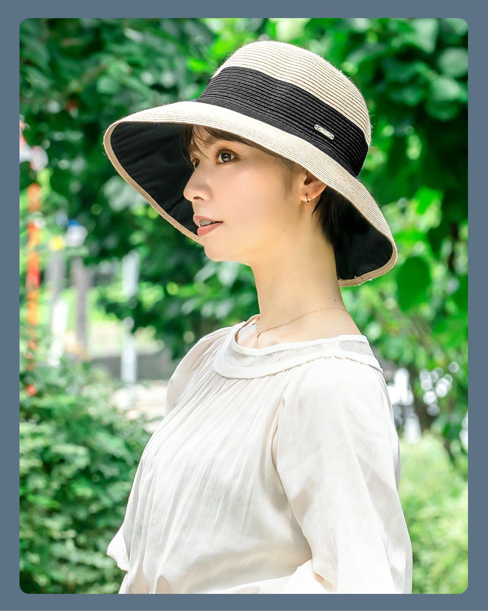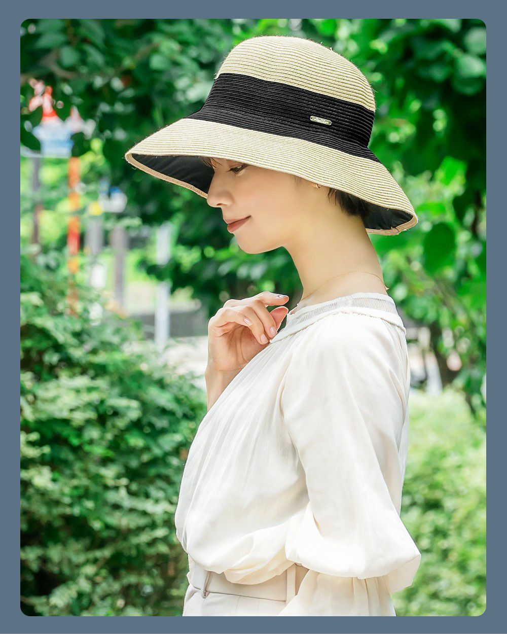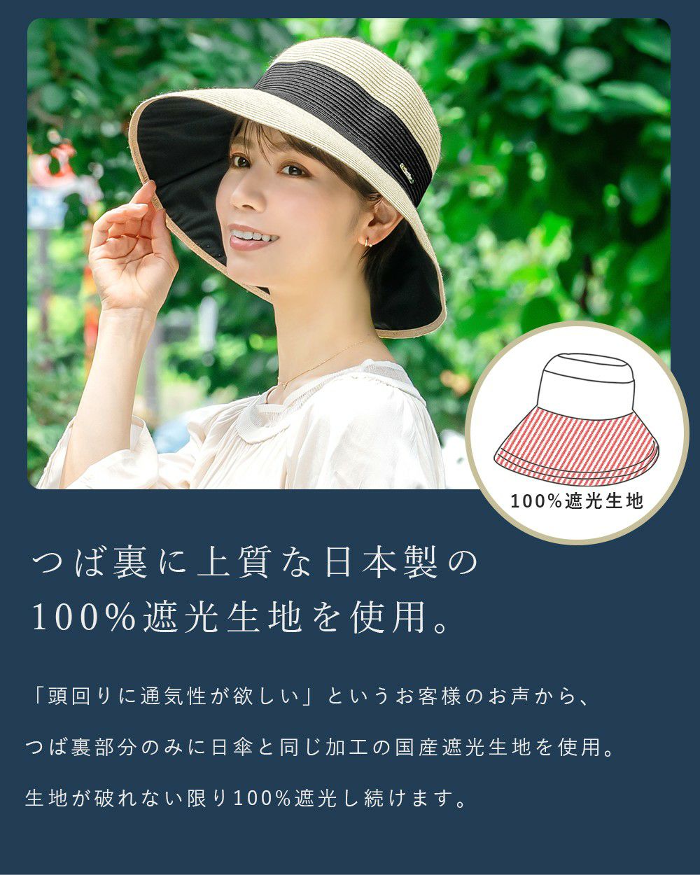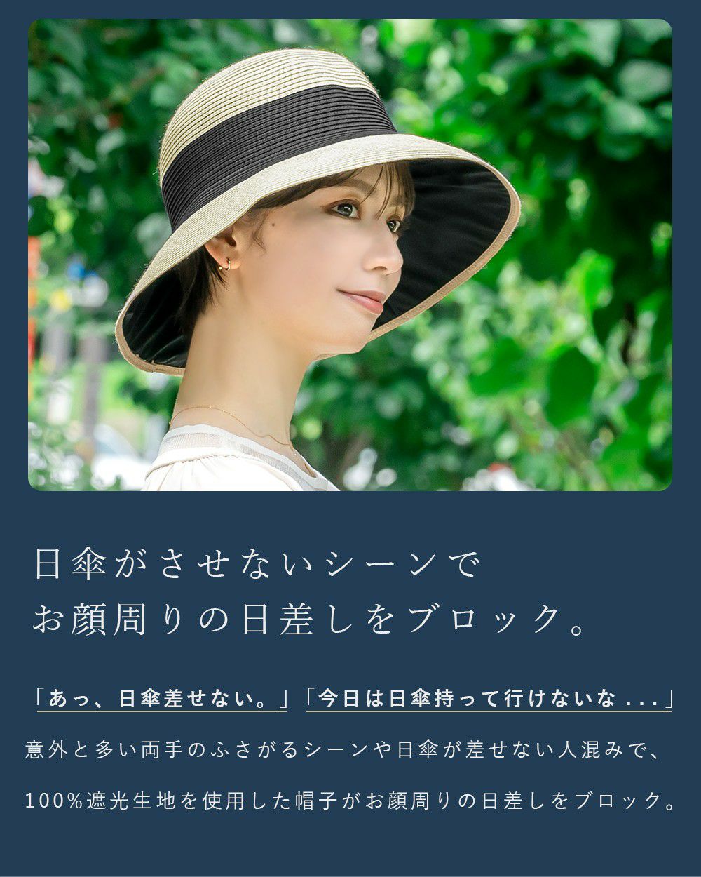 意外と多い両手の塞がるシーンや日傘が差せない人混みで、100%遮光生地を使用した帽子がお顔周りの日差しをブロックします。