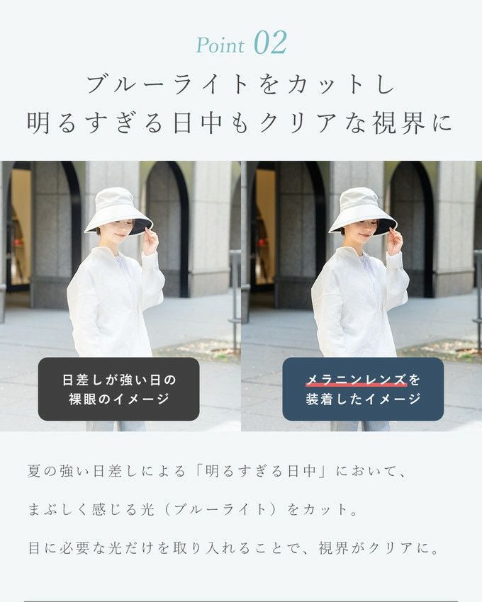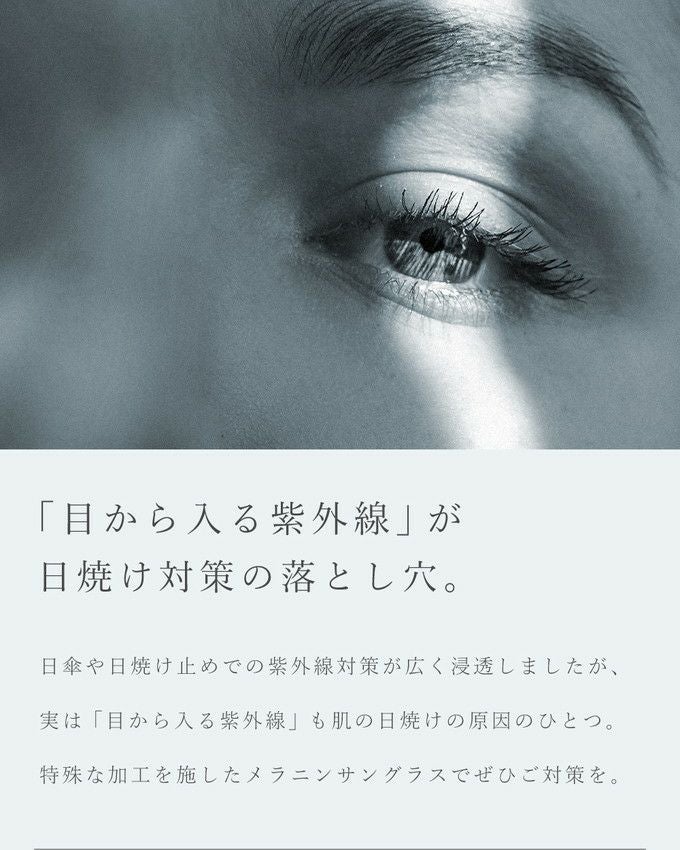 「目から入る紫外線」が日焼け対策の落とし穴。日傘や日焼け止めでの紫外線対策が広く浸透しましたが、実は「目から入る紫外線」も肌日焼けの原因の一つです。特殊な加工を施したメラニンサングラスでご対策を。