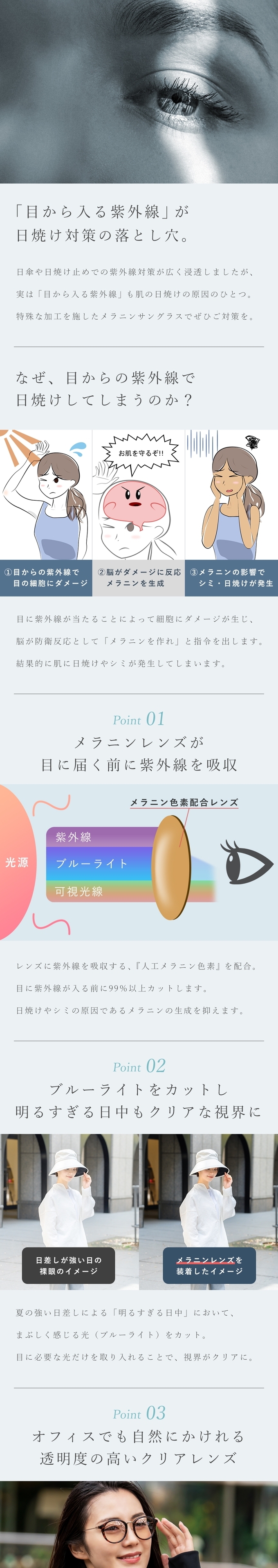 「目から入る紫外線」が日焼け対策の落とし穴。日傘や日焼け止めでの紫外線対策が広く浸透しましたが、実は「目から入る紫外線」も肌日焼けの原因の一つです。特殊な加工を施したメラニンサングラスでご対策を。