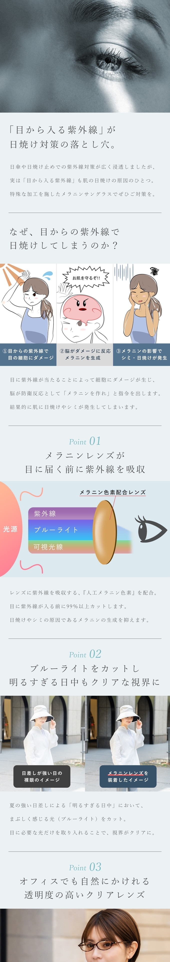 「目から入る紫外線」が日焼け対策の落とし穴。日傘や日焼け止めでの紫外線対策が広く浸透しましたが、実は「目から入る紫外線」も肌日焼けの原因の一つです。特殊な加工を施したメラニンサングラスでご対策を。