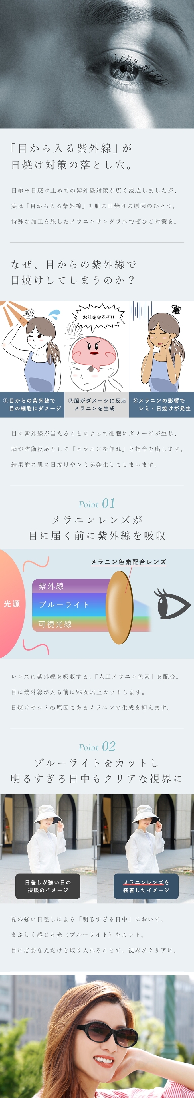 「目から入る紫外線」が日焼け対策の落とし穴。日傘や日焼け止めでの紫外線対策が広く浸透しましたが、実は「目から入る紫外線」も肌日焼けの原因の一つです。特殊な加工を施したメラニンサングラスでご対策を。