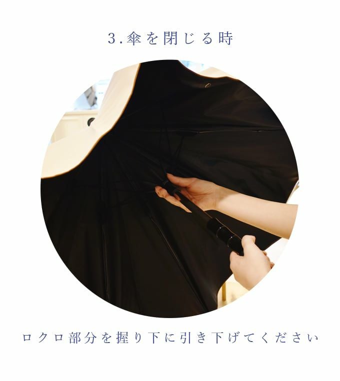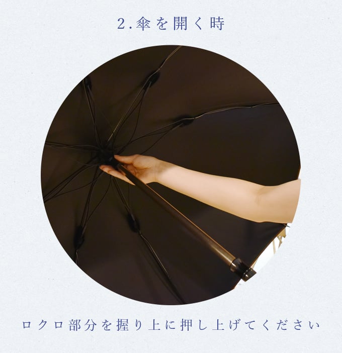 生地は高性能な為普通の傘生地より厚みがありますので、軽量な骨との重みの関係性にてやや閉め止まりにくいですが必ず紐で纏めていただけますようお願いします。