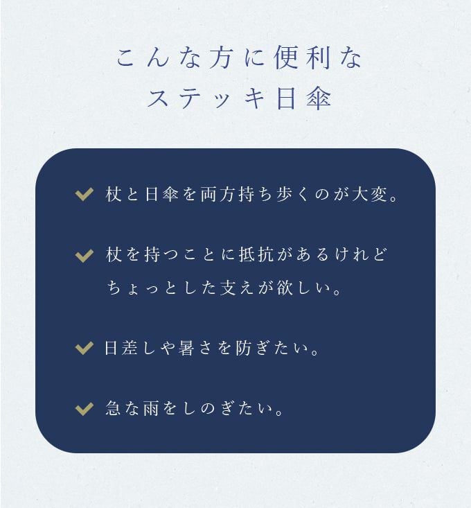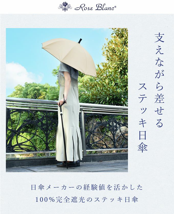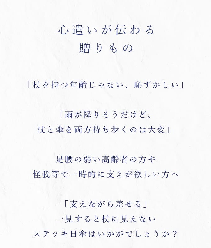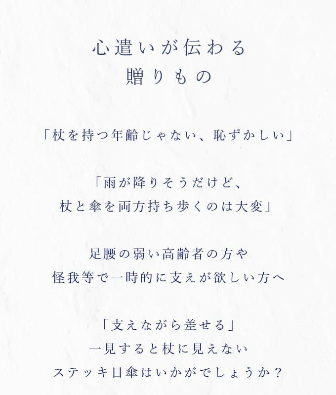 「杖を持つ年齢じゃない、恥ずかしい。」「雨が降りそうだけど、杖と傘を両方持ち歩くのは大変。」足腰の弱い高齢者の方や、怪我など一時的に支えが欲しい方へ、一見すると杖に見えないステッキ日傘はいかがでしょうか?