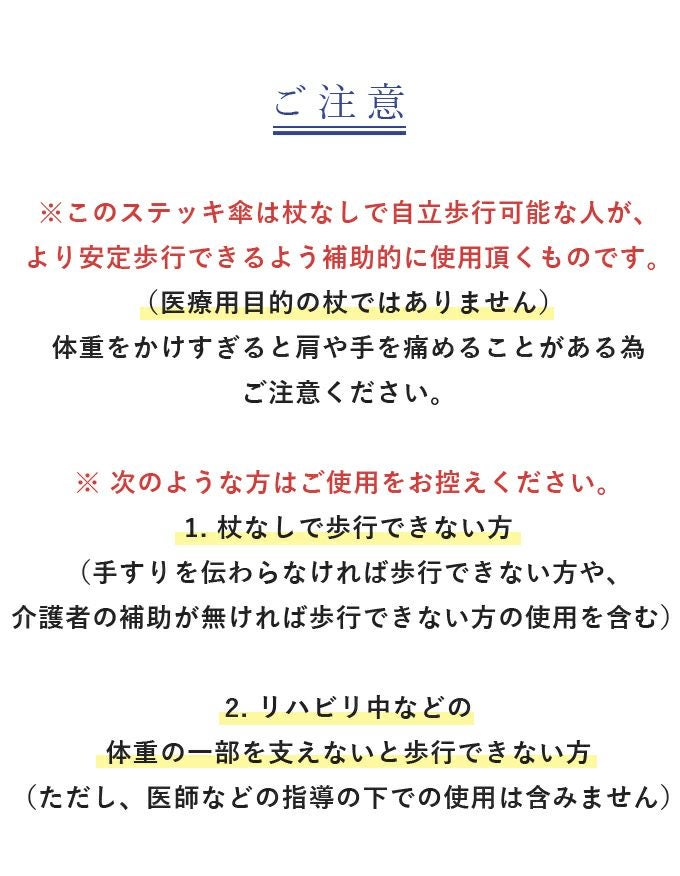 このステッキ傘はステッキ無しで自立歩行可能な人が、より安定歩行できるよう補助的に使用いただくものです。ステッキ無しで歩行できない方、手すりや介護者の補助が必要な方は、ご使用をお控えください。(医療用目的のステッキではございません)ステッキの高さ調節時やステッキを傘本体に収納する際は、指を挟まないようにご注意ください。商品に付いている下げ札の注意書きをよくお読みください。故障の原因となりますので、振ったり回転させないでください。濡れた後は回転させて水滴を飛ばさず、タオル等で雨粒を拭き取り、陰干ししてからおしまい下さい。また、強風時や極度の強雨の場合はご使用をお控え下さい。生地を骨に挟まないよう開閉ください。自転車/ベビーカー等への固定は危険ですのでおやめください。ハンドクリームや日焼け止めクリーム等が本製品の生地・手元等の色落ちの原因になる場合がありますのでご注意下さい。