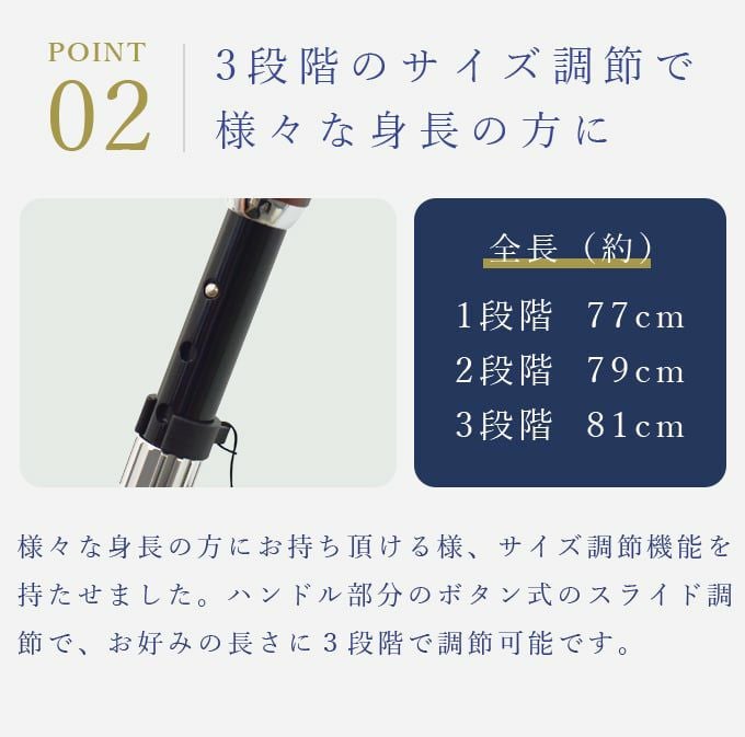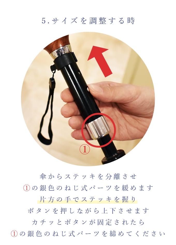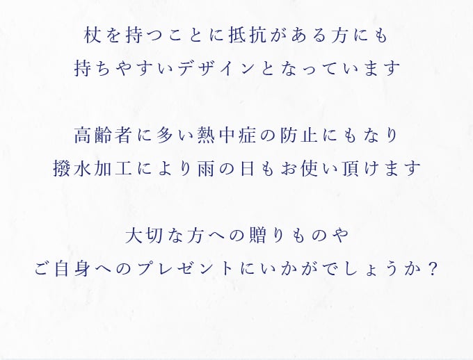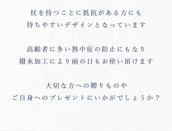「杖を持つ年齢じゃない、恥ずかしい。」「雨が降りそうだけど、杖と傘を両方持ち歩くのは大変。」足腰の弱い高齢者の方や、怪我など一時的に支えが欲しい方へ、一見すると杖に見えないステッキ日傘はいかがでしょうか?