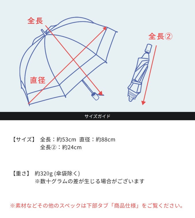 「3段折りたたみ」はロサブランの日傘の中で最もコンパクトなサイズです。折りたたんだ時の全長は24cmで、軽い日傘をお求めの方やバッグに収納されたい方にお勧めのサイズです。サイズ解説ページはこちら