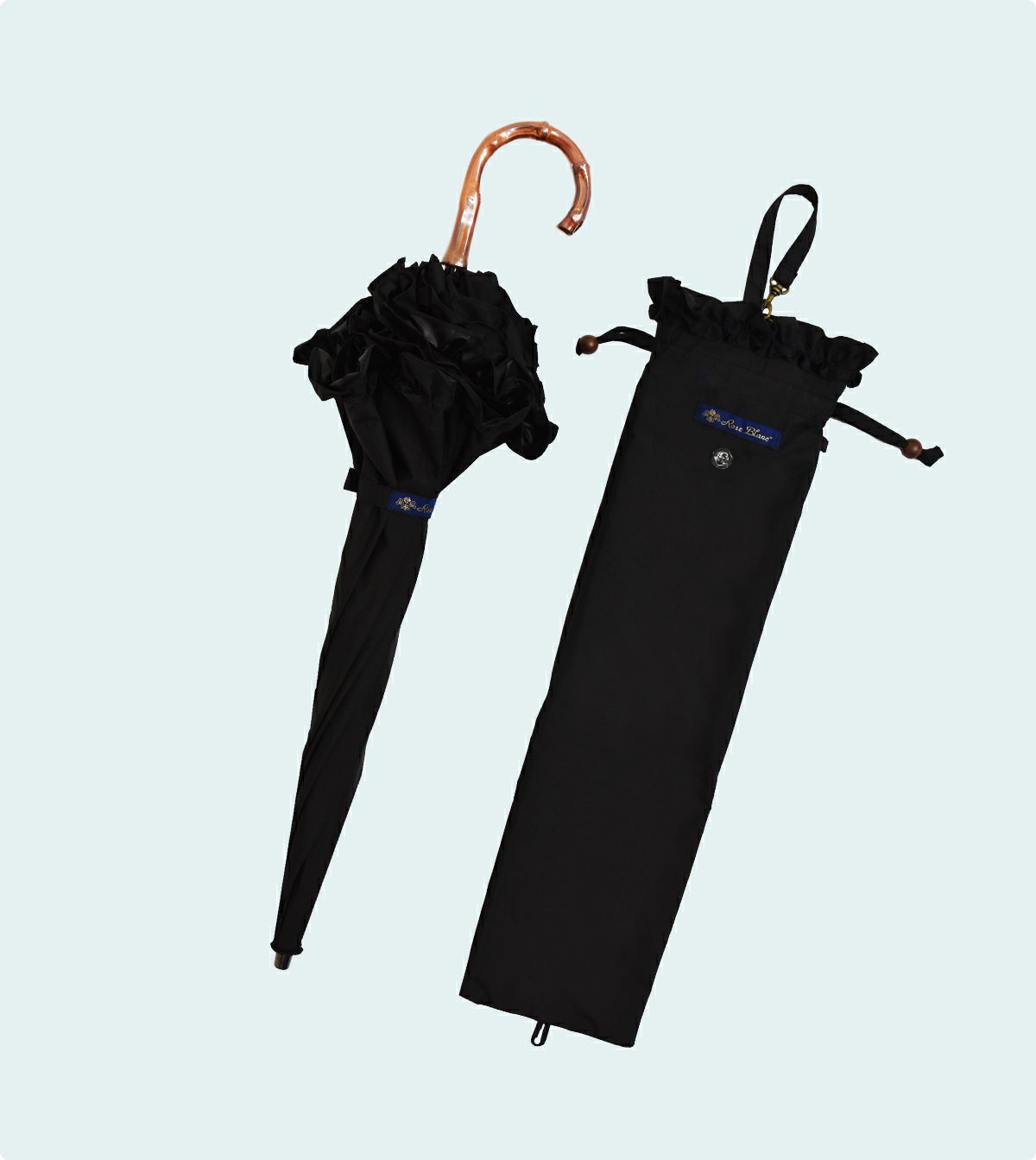 「折り畳み傘」といえば、平べったいシルエットの傘が多いですが、ロサブランの「2段折りショート」は一見すると折り畳み傘に見えない、深張りの丸みを帯びた美しいシルエットで、長傘と見分けがつかないほど自然なシルエットです。 / 00