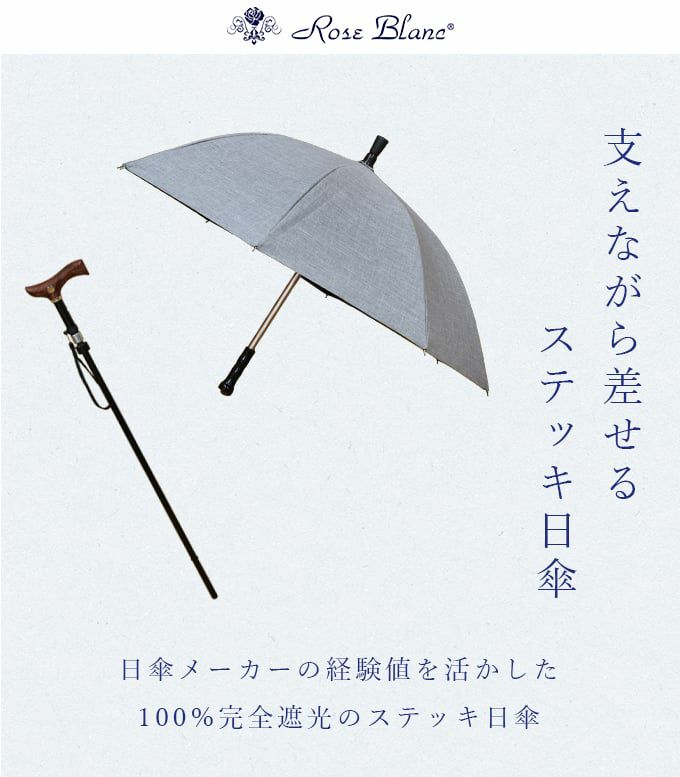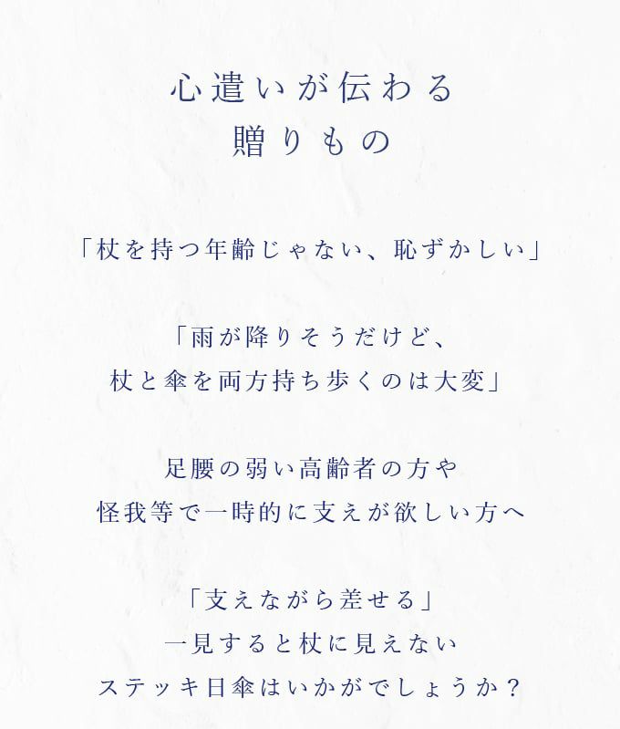 「杖を持つ年齢じゃない、恥ずかしい。」「雨が降りそうだけど、杖と傘を両方持ち歩くのは大変。」足腰の弱い高齢者の方や、怪我など一時的に支えが欲しい方へ、一見すると杖に見えないステッキ日傘はいかがでしょうか?