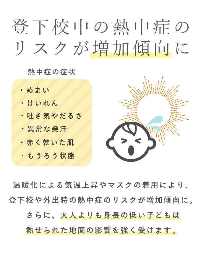 温暖化による気温上昇により、登下校中の熱中症のリスクが増加傾向にあります。さらに、大人よりも身長の低い子供は熱せられた地面の影響を強くうけます。100%遮光日傘でお子様の熱中症対策を。