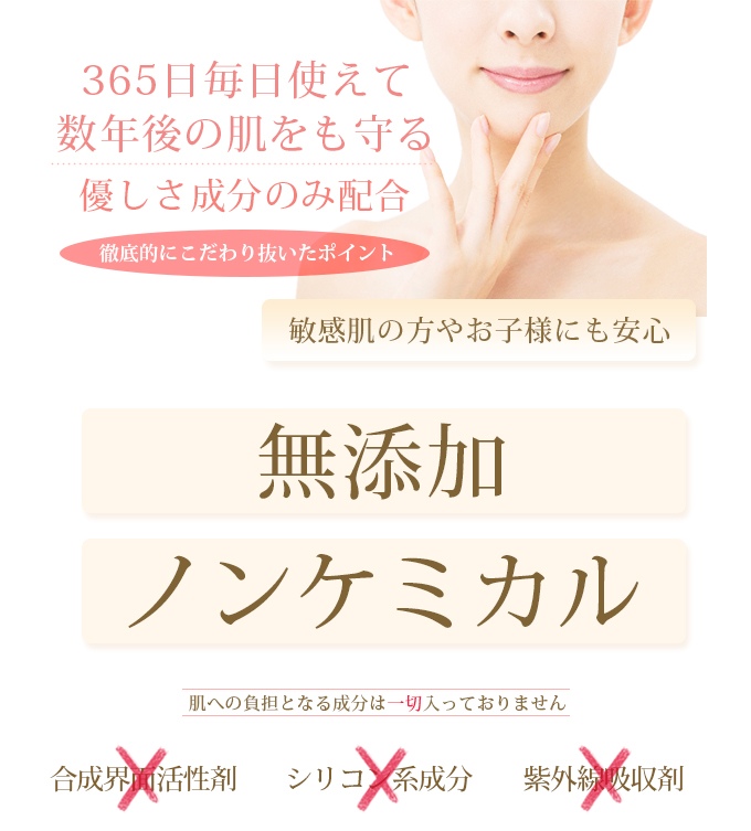 100%遮光日傘の経験値から生まれた化粧品。成分に徹底的にこだわり、お肌の弱い方から赤ちゃんまで、365日安心してお使いいただける化粧品を目指しました。