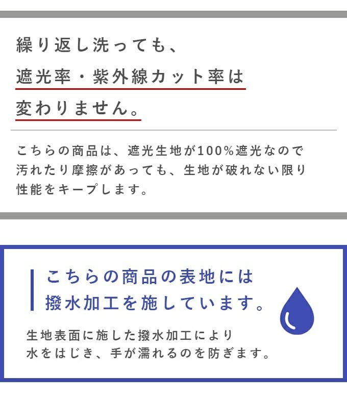 UVカット製品とは違い、本体生地が100%遮光なので汚れたり摩擦があっても遮光率は落ちず、生地が破れない限り性能をキープします。