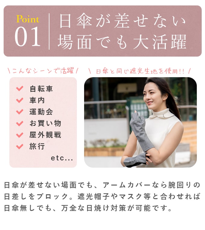 日の当たる屋内、人の多い運動会や屋外観戦、両手のふさがる日々のお買い物。意外と多い日傘が差せない場面でも、アームカバーなら日差しをブロック。ショートサイズは長袖やアウターの着用時にオススメです。※腕の内側は遮光生地ではございません。
