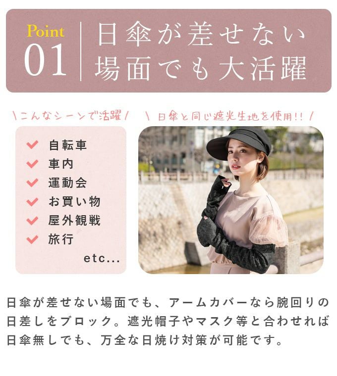 日の当たる屋内、人の多い運動会や屋外観戦、両手のふさがる日々のお買い物。意外と多い日傘が差せない場面でも、アームカバーなら腕回りの日差しをブロック。帽子やマスクと合わせれば日傘無しでも万全な日焼け対策に。※腕の内側は遮光生地ではございません。