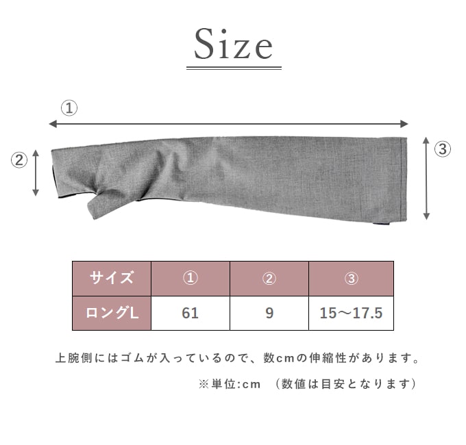 日の当たる屋内、人の多い運動会や屋外観戦、両手のふさがる日々のお買い物。意外と多い日傘が差せない場面でも、アームカバーなら腕回りの日差しをブロック。Lサイズは少しゆとりがあり、袖口にゴムが入っています。※腕の内側は遮光生地ではございません。
