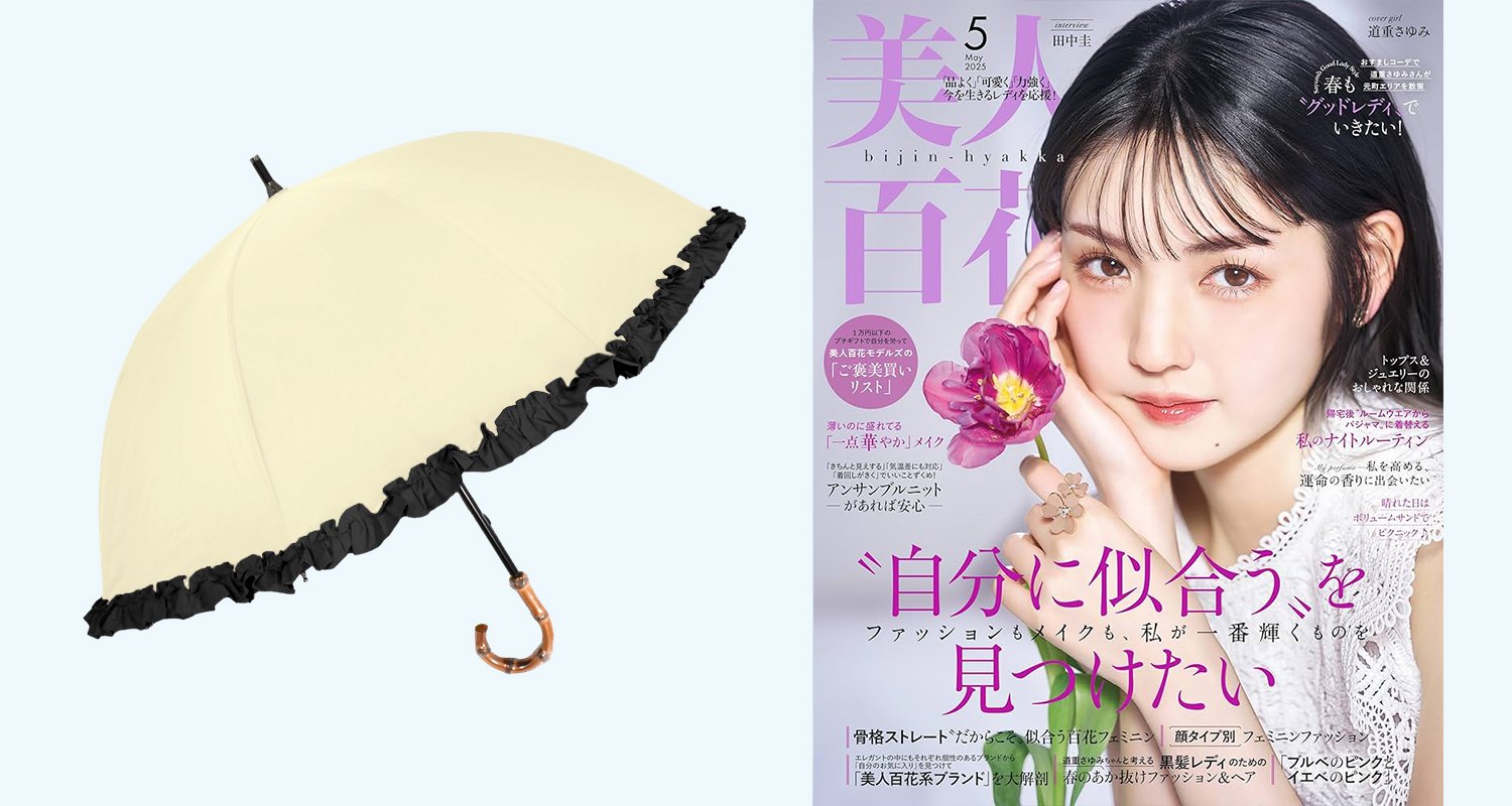 2025.06.04 雑誌「美人百貨 5月号」"ショートフリル 日傘"掲載 スタッフコラム コラム WEB担当:sakabe 写真の商品:ショートサイズ フリル(ベージュ×ブラック) 雑誌掲載:ショートサイズ フリル こんにちは。WEB担当のsakabeです。 長傘の定番サイズのショートから、大人気のフリルが 雑誌「美人百貨」の5月号でご紹介されました。 女性らしさあふれる小ぶりなサイズ感で、初めての方やサイズに迷われた方には、こちらのショートをおすすめしております。 特にこちらの「フリル」はSNSで話題となり人気急上昇中のデザインです。 是非、こちらの商品ページをご覧ください。 商品はこちらから